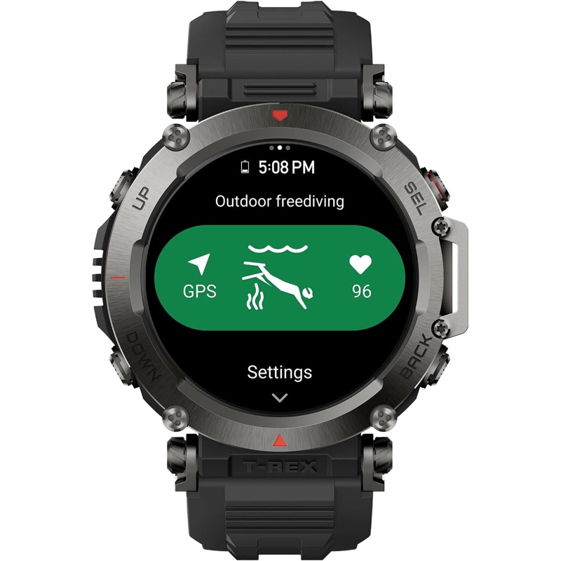 Amazfit T-Rex Ultra es un reloj inteligente con un diámetro de 47 mm y Bluetooth. Presenta una pantalla AMOLED de 1,39 pulgadas, con una resolución de 454 x 454 píxeles. Este dispositivo cuenta con un sistema operativo propio, que permite la descarga de aplicaciones a través de su tienda de aplicaciones integrada. Integra un procesador de cuatro núcleos, acompañado de una memoria interna adecuada para almacenar datos y aplicaciones. Además, posee un sistema de monitoreo de salud con sensores que incluyen un monitor de frecuencia cardíaca y un medidor de oxígeno en sangre. El Amazfit T-Rex Ultra está equipado con funciones de seguimiento de actividad física, tales como podómetro, seguimiento de sueño y análisis de estrés. Dispone de múltiples modos deportivos, permitiendo el registro de diferentes actividades. La conectividad incluye compatibilidad con smartphones a través de Bluetooth 5.0, facilitando la sincronización de datos. Tiene resistencia al agua con certificación de hasta 100 metros, siendo apto para actividades acuáticas. Su autonomía de batería se extiende hasta 20 días con un uso estándar. Este reloj mide la altitud y cuenta con un barómetro para la identificación de cambios meteorológicos. Incorpora funcionalidades de notificaciones de aplicaciones y llamadas, así como control de música. Es compatible con los sistemas operativos Android e iOS. La carga se realiza mediante un cable magnético, asegurando una conexión sólida durante el proceso de recarga.